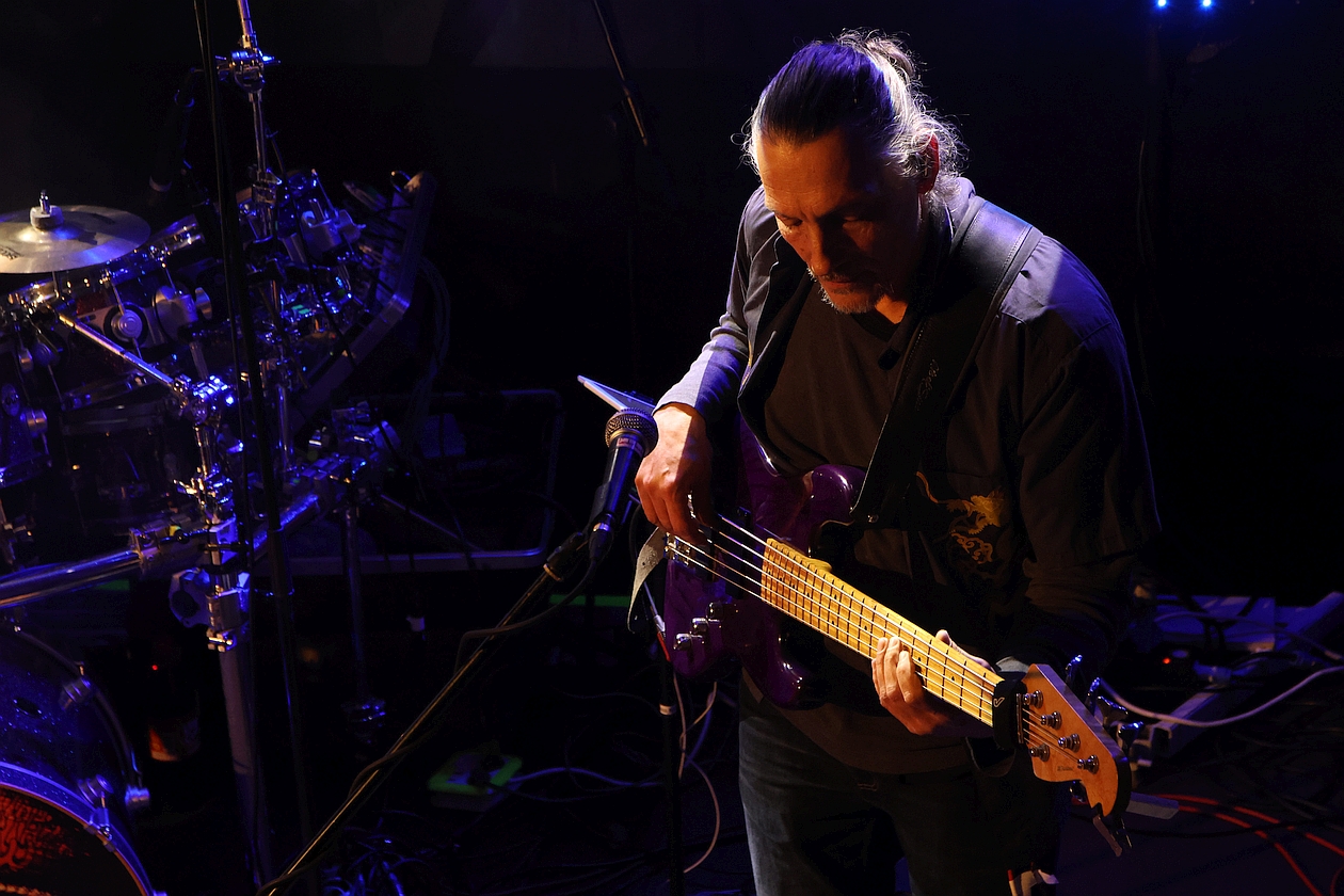 Am Ende des Konzerts aber stand die große Überraschung und zugleich kleine Sensation, über die hier unbedingt noch ein paar Gedanken verloren werden müssen. Es dreht sich natürlich um „Gedanken“, das erste Stück der ersten LP von BRÖSELMASCHINE, das auf Wunsch des Publikums das letzte des Konzerts werden sollte – und nicht vorher geprobt worden war, aber einen dermaßen fesselte und das unglaubliche Improvisationstalent der Band widerspiegelte. Hochexplosiv wie ein sic steigernder Bolero, bei dem sich BRÖSELMASCHINE in einen endgültigen Rausch spielten – so gesehen wurde aus diesem frühen Stück des Jahres 1971 anno 2026 ein echter „Gedanken“-Bolero.